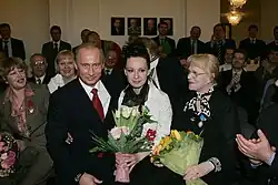 In 2012, Khamatova publicly supported Russian president Vladimir Putin during the presidential election campaign. According to Russian journalists, Khamatova was put under pressure to save her charity foundation.[14][15][16] In 2019, Khamatova said that she would never have done that if she could imagine that he would start the war in Donbas.[17] On another occasion, she said that she is actually apolitical, but the charity in Russia is heavily dependant on the support from the state.[18]