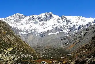 Chulu is a 6,584-metre (21,601-foot) glaciated summit in the Nepalese Himalayas. It is situated seven kilometres (4.3 mi) north of Manang in Gandaki Province. Precipitation runoff from the mountain's slopes drains into tributaries of the Marshyangdi River. Topographic relief is significant as the west face rises 1,300 metres (4,265 ft) in one kilometre (0.62 mi). The Annapurna Circuit traverses the valley below the west slopes of this peak. This peak along with outliers Chulu West (6,419 m) and Chulu Far East (6,060 m) are on the list of permitted trekking peaks.[4] The first ascent of the summit was made on July 23, 1955, by Heinz Steinmetz, Harald Biller, Fritz Lobbichler, and Jürgen Wellenkamp.[2] The first ascent of Chulu West was made on October 23, 1952, by Kinji Imanishi, Kazuhiko Hayashi, Sasuke Nakao, Jiro Taguchi, Masataka Takagi, and Sakuta Takebushi.[5]