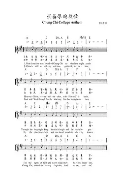 - Chung Chi College Anthem (Music by H. S. Thompson; Lyrics by Zia Nai-zin 謝扶雅)
