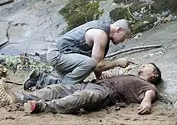 "Chupacabra" was directed by Guy Ferland and written by David Leslie Johnson. The episode features the return of Michael Rooker as Merle Dixon, who last made an appearance on the season one episode "Tell It to the Frogs". Rooker confirmed his appearance at the 2011 Aliens to Zombies Convention at the Hollywood Roosevelt Hotel in Hollywood, California.[1] "Nobody expected this level of Merle worship," he articulated. "He's such an out-there, crazy, anything goes kind of guy. There's an uncertainty about Merle—like he'll come back when you least expect it. He's the boogeyman, and viewers love that suspense. The number one question I'm asked is, 'When is your character coming back?' I can't say when, but I promise it’ll be a wild ride."[1] Writer Robert Kirkman insisted that Rooker was a delight during production, and hoped that he would regularly appear on The Walking Dead.[2]
