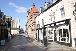Church Street first appeared in the 1620 survey by John Norden, retaining a medieval character. In the early 18th century it was sometimes known as "Church Yard Street".[3][10][13] The name "Church Street" was first recorded in 1692.[14] The street was described by Wrexham County Borough Council as having a juxtaposition of contrasting building façades, as it contains those of the half-timbered, stucco and gable types.[10]