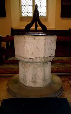 The large and undecorated baptismal font is 14th or 15th century in date and has shields carved in the recesses on its shaft. The communion rails are 17th century, with square tapering balusters.[3][5]