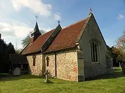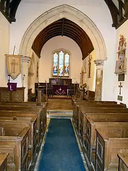 Constructed of flint and clunch rubble with the cement render removed in places, the chancel arch, window openings and the walls of the nave and chancel are probably mid-14th century in date, while the east window (a three-light window of about 1500 with decorative late 19th century glass given in 1885) and tower arch date to the early 16th century. The nave was restored in 1875, at which time the pews were added, while the chancel was restored in 1882, when the vestry and south porch were added. The short nave does not have an aisle, and has only one window in each of the north and south walls. The steeply pitched roof has coped gable parapets, while above the west bay of the nave can be seen a bell-cot with a small broached copper spire over the timber bell chamber. A pointed arch separates the west bay, as if the builders had intended to add a tower. The chancel arch dates to about 1340[5] and is similar in design to the tower arch but is more finely moulded, while the chancel's wagon roof is 19th century.[3][5][6][7] The chancel arch shows traces of a rood screen having been fixed across the archway, but this was presumably destroyed centuries ago.[4]