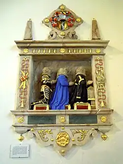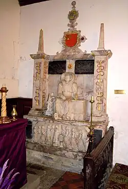 On the south wall of the chancel can be found an effigy tomb of Mary Plomer, who died in 1605 at the age of 30 after giving birth to her 11th child. A fine example of rustic Elizabethan sculpture, she is depicted as a large seated frontal figure holding a chrisom child (removed from the effigy for safekeeping) with one foot on a skull and an hour-glass in her hand. The baby is wrapped in a linen chrisom-cloth which at that time was worn for a month after christening in order to protect the sign of the cross made with chrism oil on the baby's head during baptism. This monument suggests that the baby died within a month of baptism. A smaller figure of Time is displayed to the left, with the whole tomb surrounded by decorated piers. On the plinth below is a panel depicting kneeling effigies of her other ten children, showing she had six sons, two of whom are slightly recessed showing they had predeceased her, and her four daughters, with obelisks and achievements above.[3][6][7]