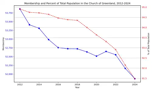 - ^ "Church of Denmark, members 2012-2024". Statistics Greenland. Retrieved 2024-09-20.