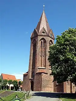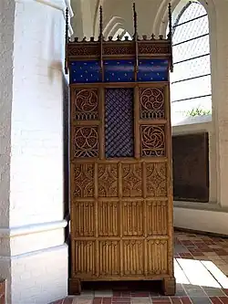 The main chapel on the north side of the church and the lower, square part of the tower are remains of a Romanesque church. In 1488 the church stood in its present form. The Catholic past of the building is heralded in a monstrance, now located to the right of the altar, and a stoup in what was then the porch.[1]