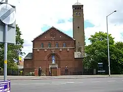 The church, situated at the junction of Bleakhouse Road with the A4123 Wolverhampton Road, was designed in Early-Christian basilican style by George Drysdale, a Roman Catholic and senior partner of the London firm Leonard Stokes and Drysdale. It was built in 1934, to seat a congregation of 500. It was opened on 3 November 1934 by Archbishop Thomas Leighton Williams, and was consecrated on 18 June 1935.[2][4]