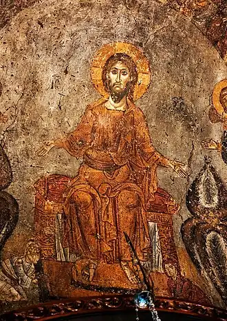 In the narthex the walls are painted with the Last Judgment, with Christ the Judge seated above the royal door into the naos.[19] Again, Anna Tsitouridou associates the prominence of the final judgment with the funerary nature of the monument.[18]
