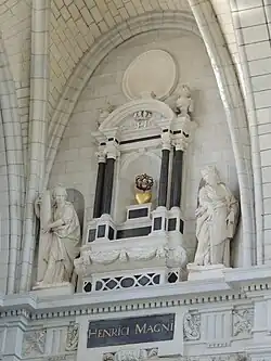 In the edict founding the college, Henri IV pledged his heart and that of Queen Marie de Médicis to the Jesuits, to be laid to rest in the church of Saint-Louis. A mausoleum project was drawn up by architect Louis Métezeau, but was eventually abandoned after his death, and replaced by two more modest constructions on the transept arms dating from 1648.[42] In the north arm, Henri IV's cenotaph is adorned with four black marble Corinthian columns supporting a curved pediment inscribed with the king's monogram. These columns frame a cul-de-four niche in which the metal urn containing the heart is perched on a pedestal.[42] The cenotaph is framed by two statues and underlined by the inscription Henrici magni on a black marble plaque. In the south arm of the transept, the construction of Marie de Médicis' cenotaph is identical.[42]
