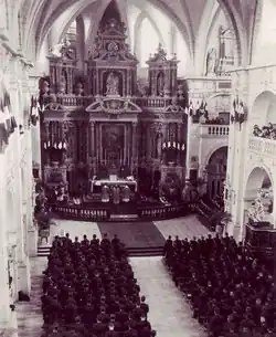 The structural work on the church was completed in 1621 with the installation of the rib vaults, and it was opened to worship the following year to mark the canonizations of Saint Ignatius of Loyola and Saint Francis Xavier. The ceremonies, presided over by Mgr Charles de Beaumanoir de Lavardin, Bishop of Le Mans, lasted eight days.[9] The church was consecrated in 1637 under the patronage of Saint Louis by Claude de Rueil, bishop of Angers.[10][11] Work on the church's interior continued throughout the 17th century. The high altarpiece was commissioned in 1633 from Laval architect Pierre Corbineau,[10] the organ loft was installed between 1637 and 1640, and the cross loft in 1648, while decoration of the chapels and choir continued until 1693.[12]