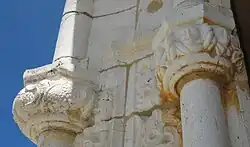 In the inside of the entrance doors are two Manueline columns, one on each side, on which are carved various figures framed in little niches. The long procession of figures probably alludes again to the supremacy of Christianity over Islam. One can pick out various musicians (with tambourines, bagpipes, violas, etc.), members of the regular and secular clergies, nobles, simple people, and slaves. These columns were only rediscovered in 1946; up to then they had been completely encased in thick layers of plaster and whitewash.[24][25]