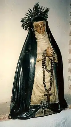 The Virgen de la Rochela is of late Gothic style and great artistic merit, her blonde hair and blue eyes make her unique in the region. Her gold-trimmed mantle still retains the original polychromy. It is of French origin, possibly from the city of La Rochelle,[7] and comes from the old convent of San Basilio, where it had an altar in the main chapel, on the Gospel side. Legend[8] has it that once in Cuéllar it was taken to the Dukes of Alburquerque, who, after drawing lots, deposited it in San Basilio.[9]