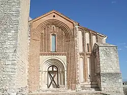 On the south façade is a stone doorway with five archivolts with bull moldings. It has a stone cornice with corbels, and the entire upper part is decorated with blind arches and friezes of angled arches.