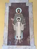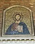The area of the Sant'Anselmo complex open to the general public is the church which was consecrated on November 11, 1900. The church was consecrated by Cardinal Mariano Rampolla del Tindaro, assisted by twelve cardinals, sixteen archbishops and bishops, fifty-two abbots, rectors of all the major colleges of Rome, superiors general of the major religious orders, and all ambassadors accredited to the Holy See.[6] It is constructed of three naves, divided by granite columns, and includes one main altar and two side altars. The ceiling is a truss and the crypt was made of five naves with sixteen side altars. In 1952 there was a renovation of the church interior by architect Fritz Metsger. This saw the construction of elevated choir stalls for the monks in the transepts, the addition of an altar under the arch that allowed the priest to face either direction in celebrating mass, and the creation of three main mosaics by the German monk Radbodus Commandeur. The mosaics are located above the two side altars, as well as above the main apse which depicts the jeweled cross between angels and Saints Benedict and Anselm. Commandeur also completed the mosaic under the main altar covering the reliquary containing the relics of Saint Alexander of Rome. He also produced numerous pieces within the monastic enclosure of the College as seen in the gallery of photos below.[7] The paschal candle stick is modern but in the Cosmatesque style. The lower level has now been converted to the use of the library for the University. In the courtyard of the atrium, there is a bronze statue of Saint Anselm made in 1966 by Swiss sculptor Albert Wider from Widnau. From here, it is possible to see Santa Maria del Priorato of the Knights of Malta, which lies in an adjacent complex that is closed to the public. In the entrance to the Sant'Anselmo complex, reached from the atrium, is a Roman Orpheus mosaic from a second-third century home that was found during construction.[8][9]