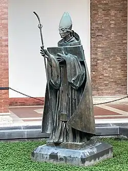 The entire "Sant'Anselmo" complex on the Aventine Hill was designed by Belgian Benedictine Abbot Hildebrand de Hemptinne and Fidelis von Stotzingen and built by Francesco Vespignani between 1892 and 1896 in a neo-romanesque style. Construction began in 1892 and the cornerstone was dedicated on April 19, 1893. The final cost was 2,500,000 lire and was dedicated in honor of the Benedictine monk Saint Anselm of Canterbury. To honor the founding vision of Pope Leo XIII, a large sculpture of him was crafted in 1891 by Giuseppe Luchetti and is located in the interior sacristy of the church. A large marble plaque of dedication is also found on the north exterior wall as you approach the entrance to the complex.[4][5]