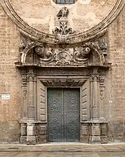 The main facade of the church retains a walled-up oculus of a rose window from the older church. The square exterior of the apse, facing the piazza, houses a central niche decorated with a stucco statuary group of the Virgen del Rosario (Virgin of the Rosary) attributed to Jacopo Bertesi. The group display the Virgin and Child (his hand on the globe) ensconced in a burst of rays, angels, and cherubs. Other portals contain the symbols of John the Baptist (lamb) and John the Evangelist (eagle). The center is surmounted by a clock tower, and a roofline dominated by statues of the Juanes: including the Baptist, the Evangelist, and Saints Francesco Borgia and Luis Bertrán. This facade includes profuse complex iconography including a lamb atop a book with five seals.