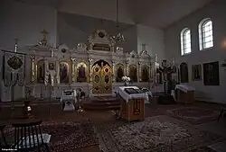 The interior of the church features a single-tier iconostasis taken from the demolished cathedral in Modlin, which was originally created in the mid-19th century.[1] From left to right, the iconostasis displays images of St. Nicholas, Archangel Gabriel, the Mother of God, Christ, Archangel Michael, and St. George the Victorious. Above the royal doors – traditionally adorned with the Annunciation scene and images of the Evangelists – an icon of the Last Supper is placed, with a smaller icon and a cross at the top. The original iconostasis contained additional icons in its lower tier, as the St. George Cathedral in Modlin was larger than the church in Stanisławowo. The fate of the original iconostasis from Stanisławowo's first church remains unknown.[13]