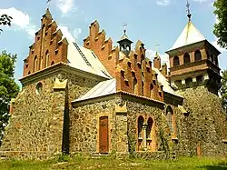 The church was built in the style of a mediaeval castle or manor house[2] using stone and brick[1] and the roof was of Polish red tiles. The belfry had three bells, the largest of which weighed 150 kg.[6] The doors were massive and forged[2] and the windows were glazed with colored stained glass, there were wall paintings, and a crystal chandelier hung in the middle of the sanctuary.[7] The acoustics were excellent.[2]