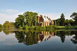 The church overlooks a small lake[1] in the southwestern part of Horodok, near the road leading to Berdichev, on the low bank of the river Lebedivka.[2] It is constructed in an eclectic style with elements of neo-Gothic and modern twentieth century architecture.[3]