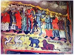 After the building of the wide narthex in 1856, it was painted as well by Dicho Zograf. Here we find the interesting fresco of the Judgment Day with the representations of the four empires of the world as animals and with four emperors – Porus, Darius, Cyrus and Alexander the Great – all led by devils to damnation.[3]