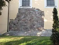 The church is built on old foundations, with the lower parts constructed from granite blocks, supplemented with brick in the upper sections. The southern and northern lower sections reveal the stone blocks, while the brick walls are plastered.[1] The church is a single-nave structure with a narrower and lower, small chancel, which is polygonally closed. The chancel is a single-bay, while the nave is three-bayed, covered by a ribbed vault with ribs resting on the strongly projecting pilasters at the corners.[1] The vault features depictions of the Holy Trinity and the Evangelists, while the chancel vault displays images of Saints Peter and Paul. The chancel arch is semi-circular. The choir is vaulted in a ribbed style and supported by three pilastered arches.[1]
