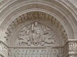 The west portal is one of the treasures of Romanesque sculpture, presenting the story of the Apocalypse according to St. John, and the Gospel of St. Matthew. Christ is seated in majesty in the tympanum, with the symbols of the Evangelists around him; according to the most common interpretation, they are the man of St. Matthew, the lion of St. Mark, the ox of St. Luke, and the eagle of St. John. The Apostles are seated below him. To the left of the portal, a procession of chosen Christians is going to heaven, while to the right sinners are being cast into hell.