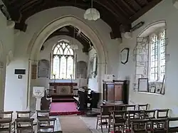 On the east wall, on either side of the altar, are stone slabs of about 1800, engraved with the Ten Commandments. There are memorial tablets on the north and south walls of the chancel, to Richard D'Aubeny (rector from 1775 to 1802) and Joseph D'Aubeny, a squire of the parish.[3][5]