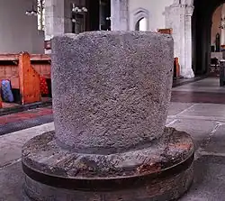 Anglo-Saxon settlement in Alton began in around AD 500 and there was certain to have been a church in the township.[2] There are no remnants of this structure left, except for the baptismal font that is now situated in St Lawrence's.[2] The font is fashioned from one massive block of stone and crude axe marks may be seen on it, showing its primitive workmanship.[2] When the church was restored in 1868 the font was discarded in favour of one of a more contemporary design; it ended up in Cirencester, but was purchased for £10 in 1934 and brought back to St Lawrence's,[2] where it stands at the west end of the south nave on a mill wheel, symbolising Alton's status as a centre of the paper industry. It has been in use as a font since 1950.[2]