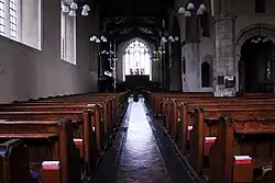 An appeal of 1920 raised £2,743 16. 7 for the church, the main work being done on the tower and the roof. The western gallery that was part of the 1868 renovations was taken down.[7] A new ring of eight bells was cast for the church in 1926 by Gillett & Johnston; the bells were hung for change ringing[33] and the old oak frame was replaced by one made of steel.[7] In 1932 it was discovered that the tower was cracking in many places, partly as a result of the bells' vibrations, so the bell cage was reinforced with steel and the walls around it were strengthened with reinforced concrete.[7] In 1939 the church was converted from gas to electric lighting, in memory of Dr E. J. L. Leslie, the vicar's warden from 1906 to 1936.[7]