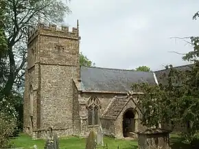 The hamstone building has slate roofs.[1] It is 57 feet (17 m) long and consists of a three-bay nave and two-bay chancel.[1][2] The 40 feet (12 m) high two-stage tower is supported by buttresses.[1][2]