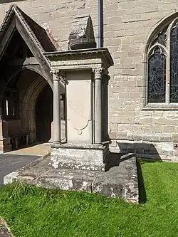 The following monuments in the churchyard are Grade II-listed: Near the south porch is a monument, in neo-classical style, to Richard Lea (died 1818). It was restored in 1993.[3] There is a chest tomb to Sarah Humphries (died 1793) about 11 metres south of the porch.[4] About 2 metres south of the chancel is a chest tomb in neo-classical style, a memorial to John Horton of Elliotts Hall (died 1817).[5] A chest tomb 9 metres south of the chancel is probably late 18th-century; its inscription is eroded.[6] A chest tomb to Elizabeth, wife of Richard Field of Blackford (died 1819) is about 12 metres south of the chancel.[7]