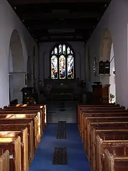 The nave and chancel form a single entity: they are not demarcated by a chancel arch.[6] They were widened in the 12th century (without the addition of aisles) to the same width as the tower.[4] Masonry from the walls of the original nave is believed to have been incorporated in the rebuilt walls.[1] The north transept has an aisle of two bays, intricate rib vaulting and small bosses. The aisle has circular piers with square abaci and delicate capitals.[4] The south transept—formerly the separate chapel of the Knights Templar—is linked to the rest of the church by a 19th-century arch and doorway. The chapel, built at a lower level than the church, is rib-vaulted and has a series of foliated capitals in a style similar to the Corinthian.[4][7]