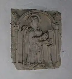 Remnants of Saxon- and Norman-era sculpture can still be seen in the church.[3][5] In the south transept, near the 12th-century font, is a carved abbot in good condition.[3][4] A 13th-century Christ in Majesty incorporates older decorative stonework. Some frieze-work is visible on the chancel wall.[4]