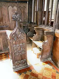 The sedilia in the chancel are believed to be 19th-century apart from the 15th-century moulded jambs. The stalls or pews inside the east side of the rood screen – three on either side of the opening – have shaped and moulded divisions and curved and moulded cappings. It is believed that these seats were brought to the church from another site. It is known that they were re-positioned during the 1880 restoration from the south wall of the chancel. They may well have been for the six priests known to be in the village in 1490.[4] The carvings on the seats on the north side are: modern; a mitred ecclesiastic; a collared animal; a bird with long wings and turned-back head. On the south side: an angel; a winged beast; an animal (mutilated); a defaced head. The two seats either side of the entry have misericords carved, with on the north side a crouching man and a demon's head, while on the south side an ape and grapes in vine leaves. With the exception of the first these carvings possibly date to about 1442.[1][2]