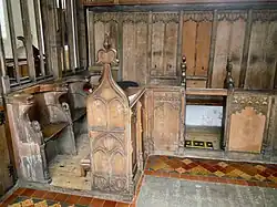 The rood screen is mainly late medieval, and is in five bays with the extra-wide middle bay being the entry. It has been much altered. The oldest parts are thought to have been in position after the restoration in the 1480s. Traces of the medieval paint colours of red, green, cream and gold still remain. At that time there would have been a small winding staircase (a vice) leading up to the top of the screen from behind the present pulpit. The doorway to the screen is still visible but the vice was bricked up in the Reformation. However the remains of the first few steps of the vice can be seen besides the modern pulpit.[4] The cornice infilling above the heads of the lights and gates are modern. In the north chapel can be found three remodelled pews, with an additional pew-end incorporated into modern seating. In the south chapel can be found two blocks of seating, each of four pews, similar to the seating in the north chapel but with original panelled fronts to the first pews. Nearby at the east end of the south aisle is a third panelled front incorporated into modern seating. With the exception of the first these seats are late medieval.[1][2]