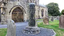 Whilst the church itself is Norman and medieval, the stone cross that is just outside the porch is of Anglo-Saxon origin. It is believed to have been carved in the 8th or 9th centuries and to have been dedicated to St Wilfrid, who was Bishop of Ripon between 667 and 669.[27] The cross, which is 6 feet 9 inches (2.06 m) tall and 2 feet 0 inches (0.6 m) in diameter, used to be known as the Paulinus Cross and is decorated with early Christian carvings.[28] Many of the carvings and representations have weathered over time, though Fisher argues that some were probably removed by those with Puritanical leanings during the Reformation.[29] It is similar to the types of crosses found in churchyards in Wolverhampton and Dewsbury.[30] The cross was grade II listed in 1966.[31][32] The church is located on the south eastern corner of the market square in Masham town centre, though the entrance faces south with views of the countryside in that direction.[33]