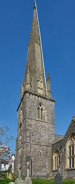 The tower is formed of three stages, with corner buttresses. It mainly dates to the 1849 rebuild by Hayward, but does feature some medieval material. The lower stage has a centred west doorway with hood mould, and small lancet windows to all but the eastern face. The middle stage has a clock in its western face, contained with a recessed stone roundel, the centre of which has some clear glass to light the chamber inside. The belfry stage has two-light Decorated Gothic-style bell openings with slate louvres. A corbel table above the belfry openings supports the spire above. The spire, of the broach design, is rare in Devon, and like the tower, dates to 1849. It has large corner pinnacles and two-light pierced stone openings in its lower stage. The spire is surmounted by a weathercock.[1]