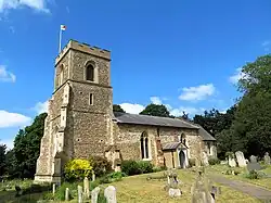 The oldest part of the church is the south end of the nave and the Norman clunch chancel arch. The tower was built in the 15th century and the nave was extended at that time to connect with it and the walls of the nave were heightened. The windows and porch also date from that time, as do the older pews and the font.[6] In 1814 the north doorway was blocked up and the coat of arms which now hang over the south door replaced an earlier larger one. The pulpit dates from the 17th century.[1]