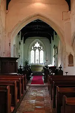St Vincent's church was consecrated by Herbert de Losinga, Bishop of Norwich,[2] and is built of clunch rubble masonry with dressed stones visible on the stair turret. The outer walls were rendered in Roman cement during the Victorian period with scribed lines intended to imitate ashlar. The chancel is 31 ft. 3 in. by 12 ft. 7 in., the nave 48 ft. 3 in. by 15 ft. 9 in., its west end is cut off at 7 ft. 7 in. from the west by an arch carrying the east wall of a small west tower, and a south aisle with porch.[3] The nave has three bays, and some of the nave walling in the church is possibly 12th-century, while the chancel was rebuilt or lengthened in the early 13th century. The South aisle and West tower date to about 1340 or earlier. From 1420 to 1440 repairs and additions to the church were made by John of Wheathampstead, Abbot of St Albans, probably including the octagonal baptismal font, the East window, the clerestory windows, the stair turret and the South porch. There are fragments of 15th-century glass in the West window of the South aisle and in the South clerestory. The church was renovated in 1881.[1][4]