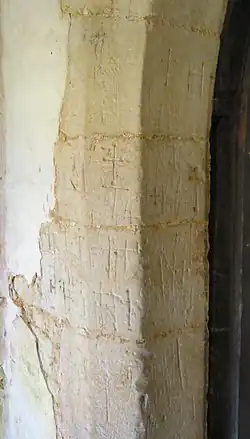 Because clunch is so soft its use in the construction of the church has encouraged graffiti, in particular around the main entrance and in the south porch; however, due to weathering some of these have now faded. Especially noteworthy are the votive crosses inscribed by Mediaeval pilgrims and other travellers who visited the church on their journeys, possibly to the Abbey at St Albans, and which are still visible on the outside of the door arch. Clearer examples of a fish and a windmill can be seen around the doorway to the belfry turret.[4]