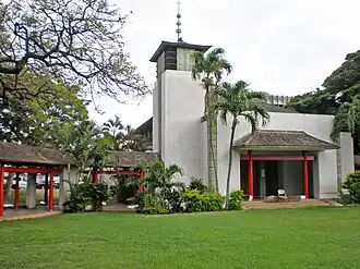 The eclectic architecture of the church buildings well reflect the varied ethnicity of the congregation, whose founders in 1923 formed the first racially mixed Protestant congregation in the Territory of Hawaii. Its charter members were students from a parochial school, Mid-Pacific Institute, which was founded to Americanize and evangelize local-born children, and from a public school, President William McKinley High School, where two-thirds of the students in 1930 were Japanese Americans. Among its first leaders were a handful of White American educational evangelists with strong ties to Asia and Hawaii.[4] Its first pastor (1923–1946) was Galen R. Weaver, a graduate of Ohio State University and Union Theological Seminary in New York who had originally planned to become a missionary in China.[5]