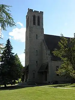 The now third and present stone church building was due to tireless efforts of the Rev. E. A. Goodnough.[4] In 1870, the Oneidas gave one day a week to quarry the stone. An excellent building plan was prepared by the Rev. Charles Babcock, who was also an architect, as a gift to the mission. The building was to be in the early English style, with low massive walls, heavy buttresses, and a steep roof. It was to be 48 feet (15 m) by 68 feet (21 m), exclusive of porch and chancel. In 1886 the cornerstone was laid, and the building was consecrated in 1887 and named Holy Apostles. In 1895 the chancel was erected. On July 17, 1920 the stone church was struck by lightning and destroyed by the fire, but then rebuilt on the old foundations and re-consecrated by the Rt. Rev. R. H. Weller, Bishop of Fond du Lac on June 11, 1922. The church bell, dedicated to the "Glory of God in pious memory of John Henry Hobart, Bishop of New York" was re-cast after the fire.