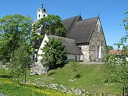 The church itself is a two-aisle church made of grey granite. The choir features fresco-secco style murals depicting the Biblical story of salvation. The paintings are from the time of Arvid Kurck, who was Bishop of Turku 1510–1522.[3] The Bell tower was built in 1816. It was made of stones from the ruins of the Church of the Holy Trinity. The white steeple used to serve as a landmark for seafarers.[4]