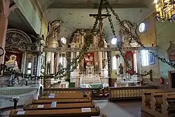 The church has three naves and a three-wall apse, seven ornate and colorful altars. The high altar was created c. 1752, the altar of St. Michael c. 1785. The plasticity of the wooden altars imitates stone architecture.[1]