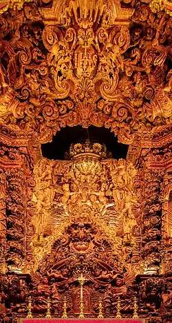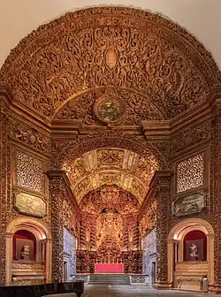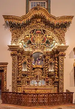 The tops of the nave are truncated by two side altars with rounded arches, surmounted by two frames in low relief hiding spaces for shrines, and two tribunes protected by a lattice (coated with a profuse amount of decoration carved in acanthus). Over the rounded, triumphal arch is a medallion with a representation of the Virgin. The chancel, which is deep and quite high, is covered by a false barrel vault with six carved coffers, forming a rosetta, while the side walls are covered by woodwork and azulejos depicting two scenes: the "Transportation of the bunch of grapes from the Promised Land" (Gospel) and "fall of Manna and harvesting by Moses" (Epistle); these scenes are separated by two doors. The altar, surmounted by a concave vault, is defined by four twisted columns decorated by acanthus, and in the center, a perfect round podium adorned with carved acanthus. The set is topped by bulbous canopy, that allows the hanging of drapery between the proscenium arch, supported by angels and cherubs. Along the lateral axes of the tabernacle are awnings and drapes in semi-circular pediments, adorned with acanthus and feathers. Laterally, along the church, are corridors united at the chancel. The vestry walls are covered by azulejos.
