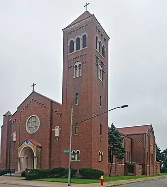 The church is an Italian Renaissance style building constructed of multi-tonal brick, with limestone trim and a red clay tile roof. The facade has a three-story gable front with a five-story bell tower on one side. It has a central entrance, approached by three limestone steps which lead to a two-story tall limestone and mosaic tile clad entrance portico. Above the portico is a large rose window.[2]