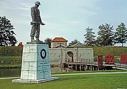 The namesake of the park, Winston Churchill, is commemorated with a bust designed by Oscar Nemon from 1955.[2] Another bust, designed by Svend Lindhard and placed outside the Resistance Museum, commemorates Major Anders Lassen, the only Dane to have received the Victoria Cross for his efforts in World War II. Lindhard is also the artist behind a Memorial to fallen Danish soldiers in the Allied Forces, which stands on Sjællands Ravelin, the ravelin in front of the main entrance to Kastellet. It depicts a soldier in English uniform.
