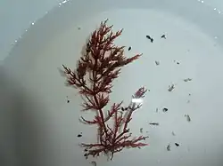 Chylocladia verticillata is a marine alga which grows erect to a length of 30 cm from a disk-shaped holdfast. It branches in a whorled manner the thallus is hollow and shows constrictions at intervals, it is mucilaginous, gelatinous, and up to 5 mm broad. In colour it is pinkish or purple. The structure is multiaxial.[1][2]