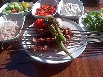 ![]() Ciğer kebab on a plate with accompanying vegetables. | |