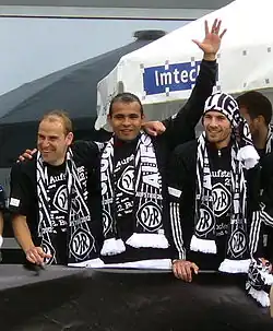 Robert Lechleiter, Cidimar and Enrico Valentini celebrate VfR Aalen's promotion in 2012